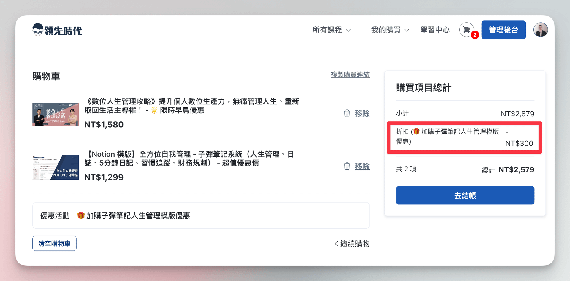 3. 在購物車頁面,就會自動套用合購折扣囉!(如下圖)