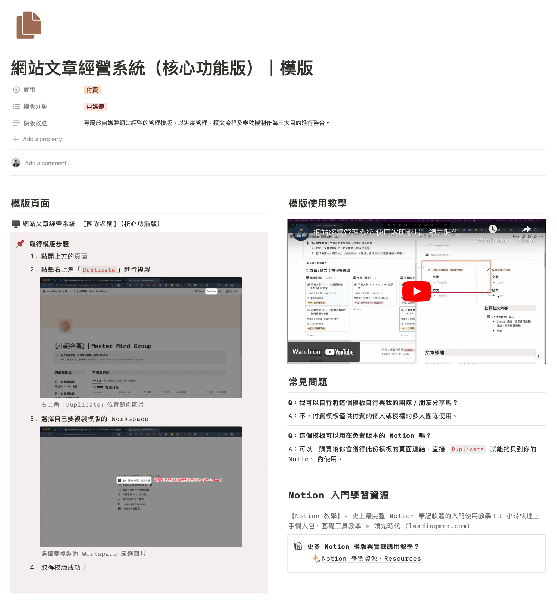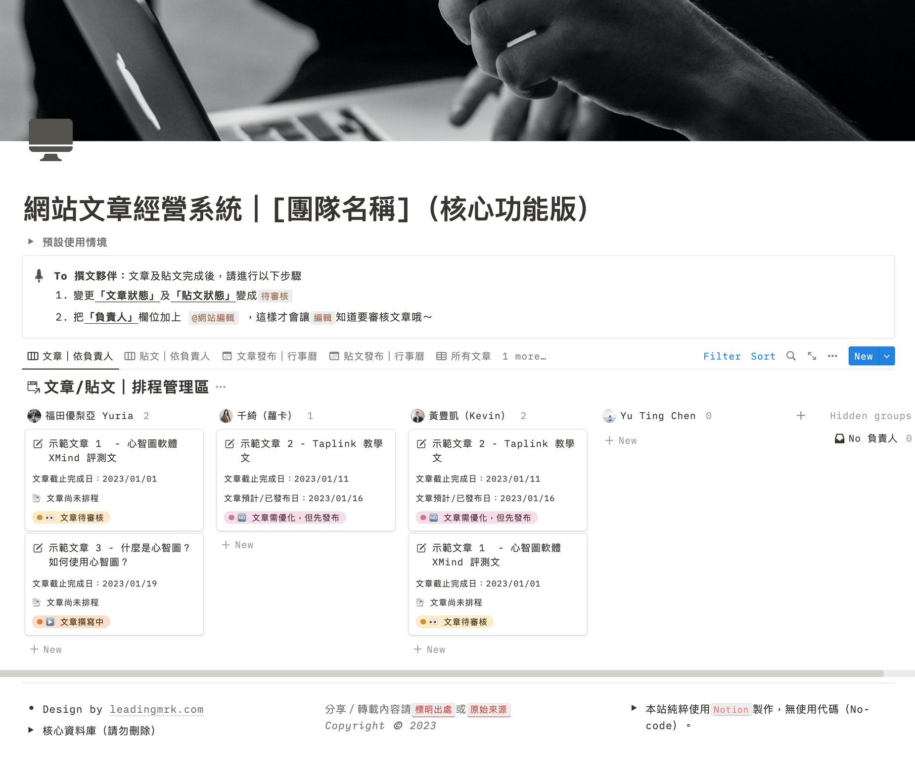 【Notion 模版】網站文章管理經營系統(核心功能版,以團隊經營為主,個人也適用)